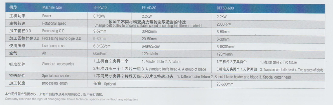 機械特點: 1 夾模與刀盤經過精巧的設計,確保加工物件與刀盤的中心線準確不變。可以一次均勻地完成管端的外角,內角及管端的加工。 2 利用皮帶輪的變化可轉換多個轉速,適應各種不同材質的金屬材料,取得更長的刀具壽命。 3 兩段進刀速度節省工時,且慢速易于調整,加工完美。